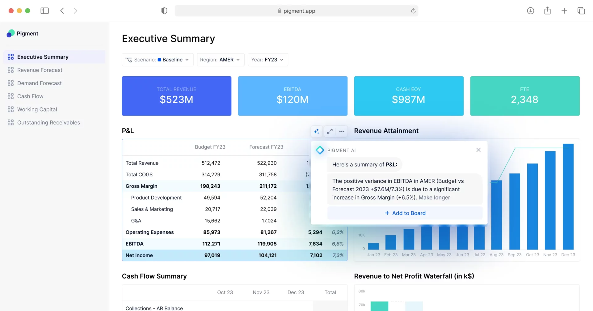 With AI, the option to focus on the exception based on set thresholds, becomes a day-to-day practice. Instead of going over thousands of data points, Pigment shows the exceptions so the planners can focus on the important topics.